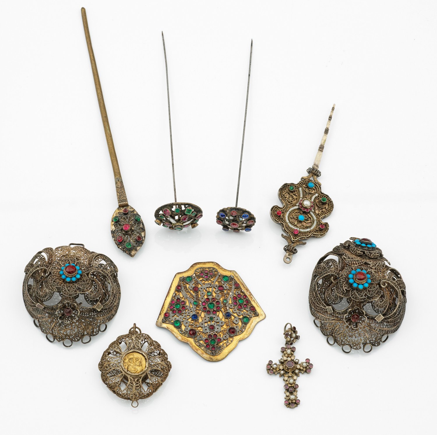 Eisen bzw. Silber, teilw. vergoldet. Miederstecker, Haar- und 2 Hutnadeln, 2 Wallfahrtsanhänger, Gürtel- und Florschnalle (2-tlg.). Teilw. mit folierten Glassteinen blütenförmig besetzt. Teilw. für Dachauer Tracht. Florschnalle gest. 13 Lot, Beschauzeichen.
