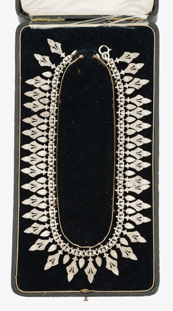 Silber, französischer Garantiestempel. Gliederkette mit ornamentierten stilisierten Palmetten-Blättern. Gew. ca. 59,83 g. Original Etui.