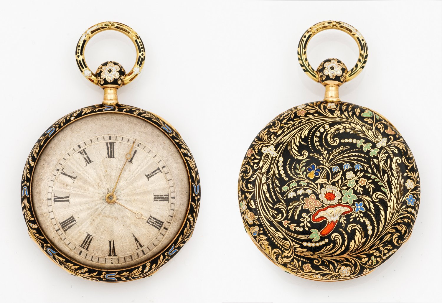 Gelbgold, 18 ct., teilw. polychrom emailliert. 2-Deckelgehäuse, schauseitig gravierter, floraler Dekor, fein guillochiertes Zifferblatt, schwarze römische Zahlen und Breguetzeiger. Mechanisches Werk mit Schlüsselaufzug, Viertelrepetition. Herstellerzeichen. Gew. ca. 53,30 g.