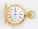 Gelbgold, gest. 18 ct.; Fein guillochiertes 2-Deckelgehäuse, weißes Emailzifferblatt mit schwarzen römischen Zahlen und gebläutem Dauphin Zeiger, Kleiner Sekunde und Minuterie. Mechanisches Werk mit Handaufzug, 3/4 Platinenwerk, ornamental gravierter Unruhkolben, Werk-Nr. 17582. Herstellerzeichen. D. 48 mm. Gew. ca. 97,04 g. Original Etui.