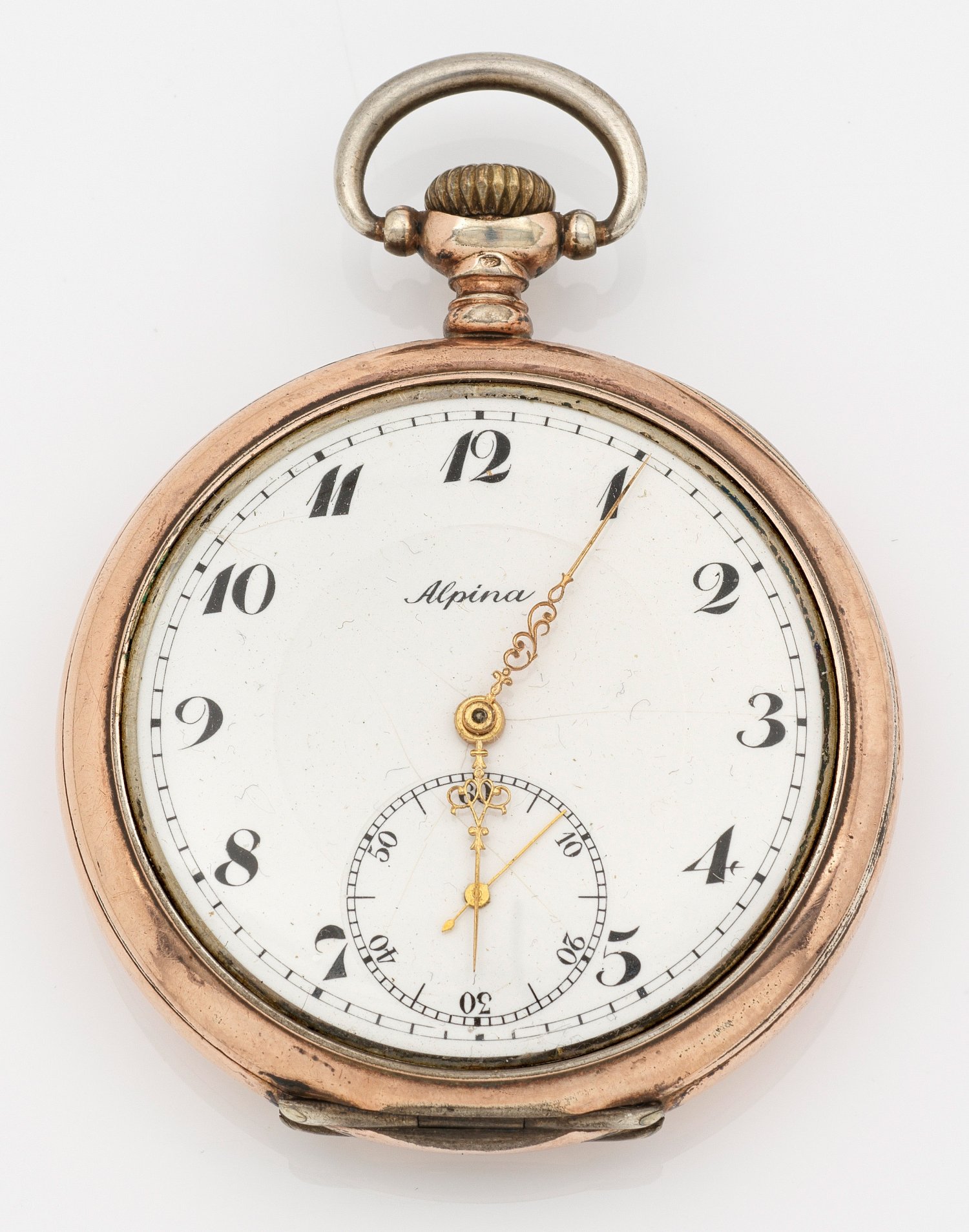 Silber, gest. 800. 2-Deckelgehäuse mit Kaiser Monogramm, im Staubdeckel Porträt Kaiser Wilhelm. Weißes Emailzifferblatt, schwarze arabische Zahlen, Dauphinzeiger, Kleine Sekunde. Mechanisches Werk mit Handaufzug. Im Deckel Inschrift Geschenkwidmung für 25-jährige Treue, Gehäuse-Nr. 139953, Werk-Nr. 139953. D. 53 mm. Gew. ca. 85,92 g.