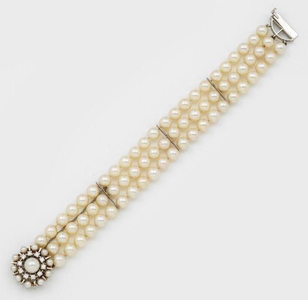 Weißgold, gest. 750. 3-reihiges Armband aus cremefarbenen Zuchtperlen von ca. 6,7 mm in sehr feinem, rose-grün changierendem Lüster. Schließe mit Brillanten von zus. ca. 0,20 ct. besetzt.
