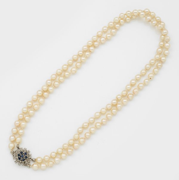 Weißgold, gest. 750. 2-reihige Kette aus cremefarbenen Zuchtperlen von ca. 6,2 mm in sehr feinem rosé-grün changierendem Lüster. Schließe mit Saphiren besetzt.