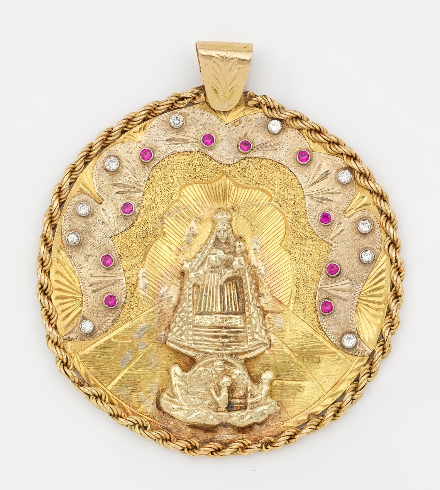 Gelbgold, gest. 585. Großer Medaillon-Anhänger mit reliefierter Madonnendarstellung, akzentuiert von zehn Brillanten von zus. ca. 0,7 ct. (w/si) und zehn pinkfarbenen Steinen. Gew. ca. 100,00 g.