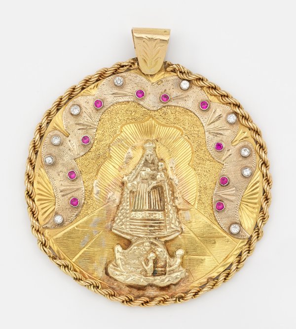 Large medaillon pendant depicting the holy virgin from El Cobre (Cuba) set with diamonds approx. 0,7 ct. (w/si) and pink coloured stones, in 18 k gold. Certificate included.