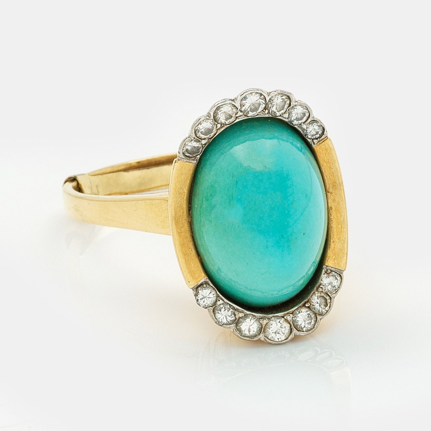 Gelbgold, gest. 750. Zentral besetzt mit Türkiscabochon, gerahmt von Diamanten von zus. ca. 0,70 ct.; Gew. ca. 13,57 g.