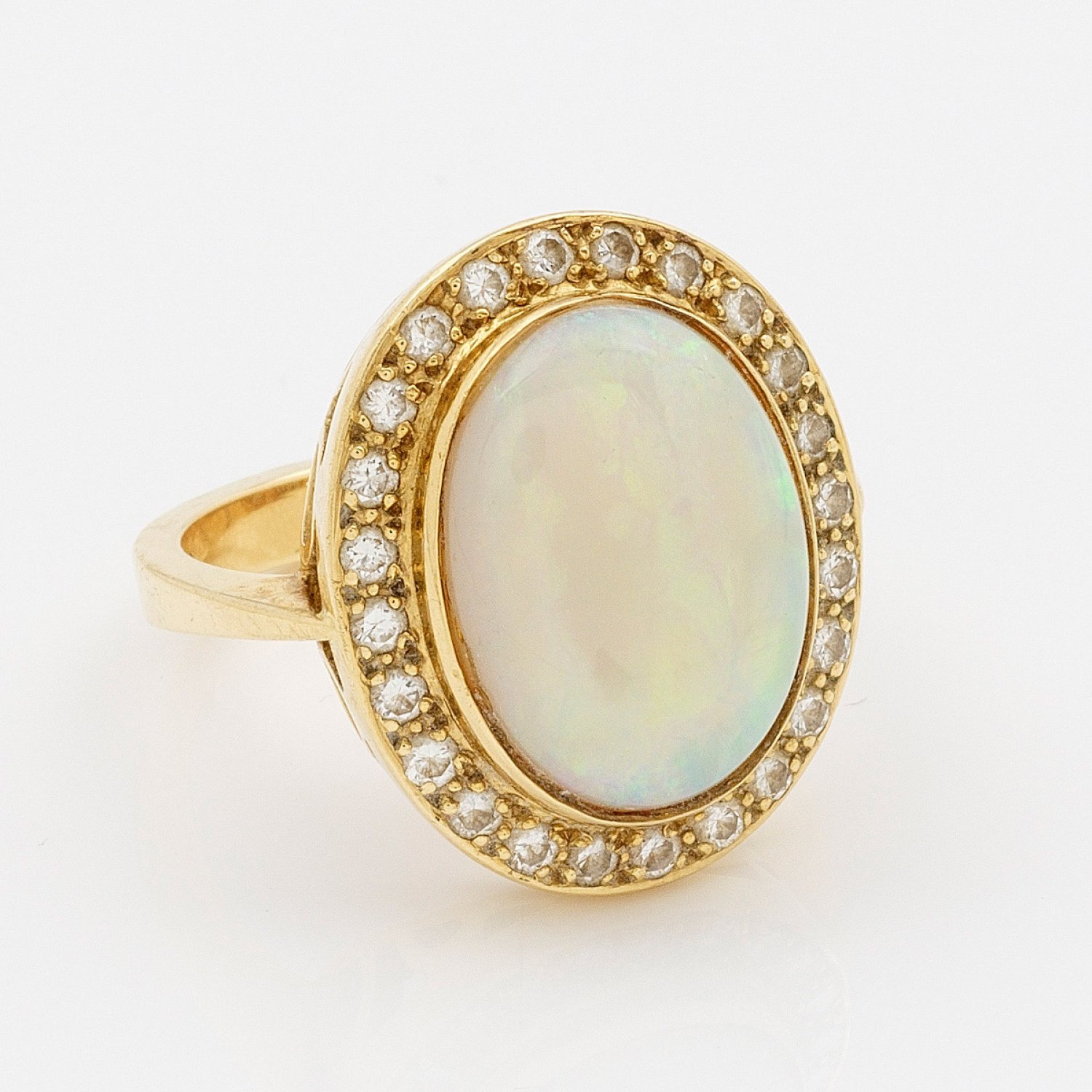 Gelbgold, gest. 750. Zentral besetzt mit einem Opalcabochon in sehr schönem Farbspiel von ca. 6,01 ct., entouriert von Brillanten von zus. ca. 0,75 ct.; Gew. ca. 10,00 g.