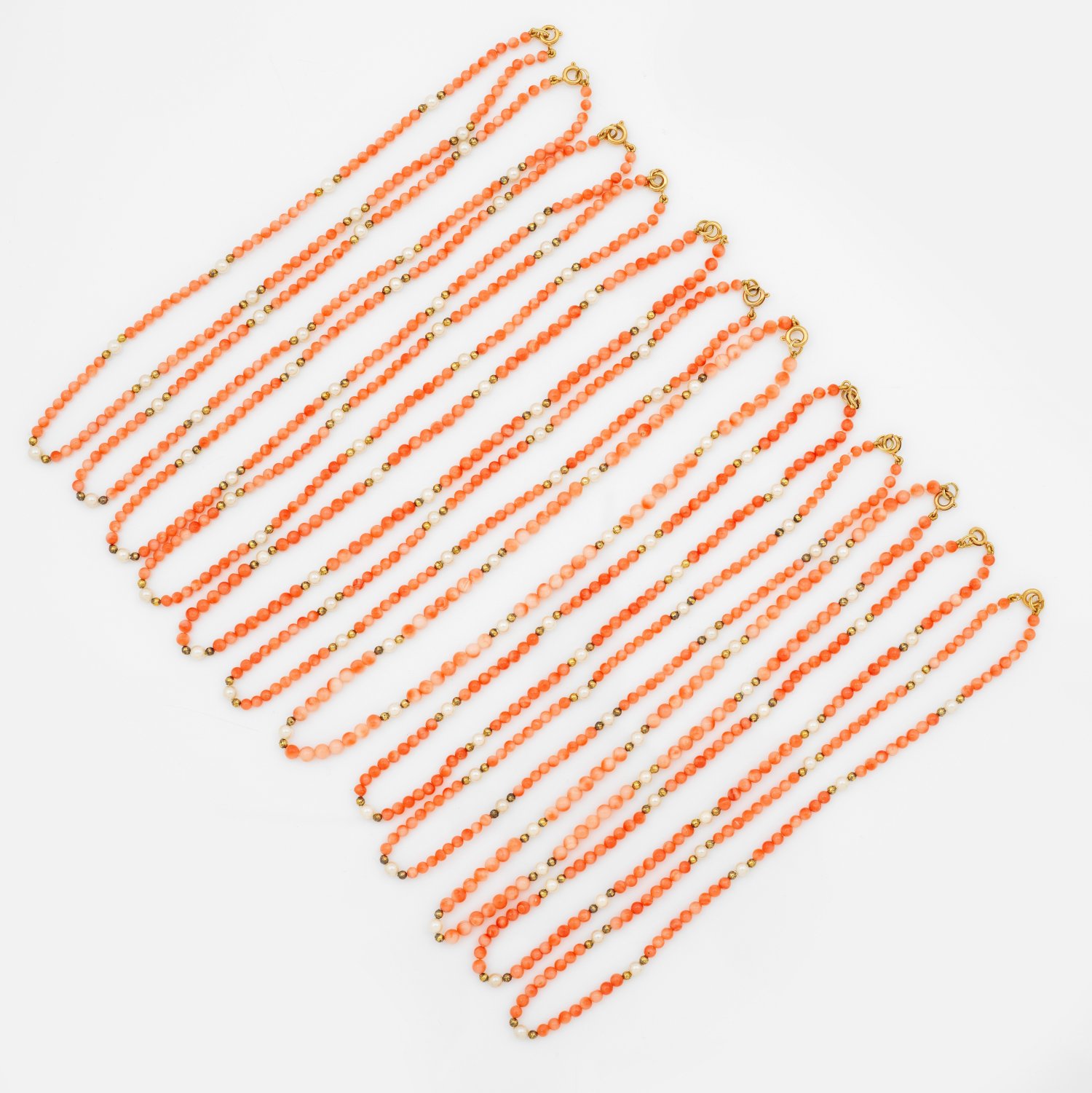 Twelve necklaces set with coral pearls, white culture pearls and small gilded pearls.