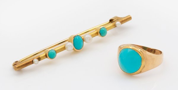 Ring and a brooch set with turquoises and small culture pearls in 14 k gold.
