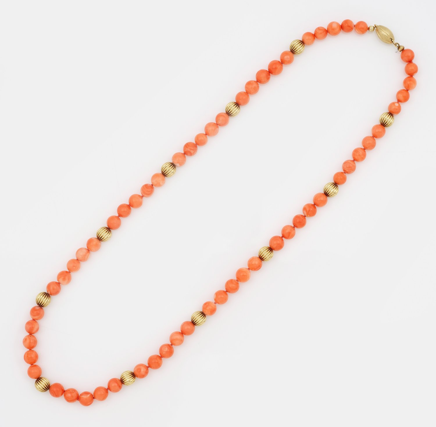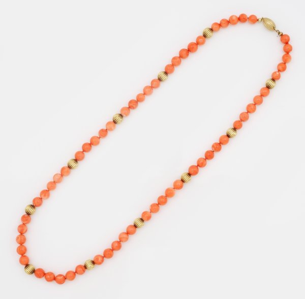 Gelbgold, gest. 585. Einreihige Kette aus lachsfarbenen Korallen-Perlen von ca. 8 mm, akzentuiert durch korrespondierende, geriefte Goldperlen. Olivenförmiger, satinierter Steckverschluss. Gew. ca. 48,13 g.