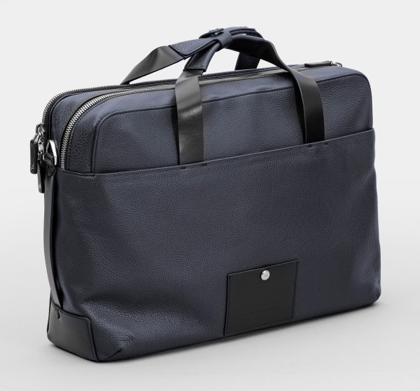 Nachtblaues, genarbtes Rindsleder und schwarzes Leder. Rechteckiger Korpus mit zwei Reißverschlüssen für zwei Hauptfächer sowie zwei Handhaben. Innen diverse Nebenfächer, teilw. mit Reißverschluss. In der Front kleines Fach sowie vorder- und rückseitig flaches Nebenfach. Abnehmbarer breiter Schulterriemen. Herstellerzeichen. Originaler Staubbeutel. Neuwertig. H. 29 cm. 42 cm x 15 cm.