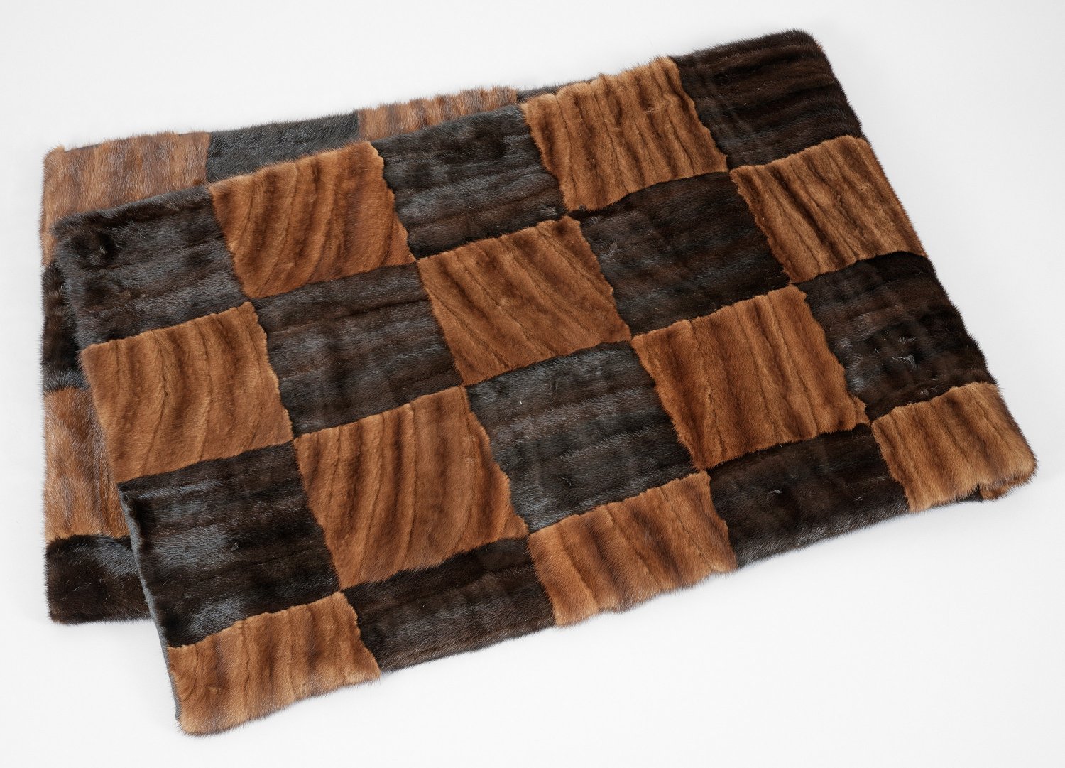Rechteckige Decke aus mittelbraunem und schwarzbraunem, im Würfelmuster angeordnetem Nerz in ausgelassener Verarbeitung. Rückseite aus dunkelgrauem Woll-Cashmere. 204 cm x 145 cm.