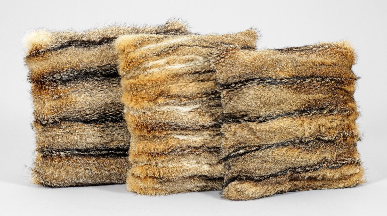 Nahezu quadratische Kissen aus in Bahnen angeordnetem, ausgelassen verarbeitetem, südamerikanischen Graufuchs. Rückseiten aus antrazitfarbenem Woll-Cashmere. Inlett. 33 cm x 36 cm, 38 cm x 38 cm und 38cm x 33 cm.
