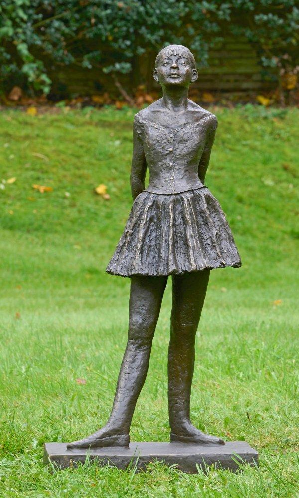 Bronze, braun und graugrün patiniert. Bez.; Posthumer, zeitgenössischer Guss, 21. Jh.; Auf einer rechteckigen Plinthe stehende, junge Ballerina, ihre Hände hinter dem Rücken faltend. Die "Kleine Tänzerin" ist die einzige Plastik, die Degas zu Lebzeiten zeigte - 1881 auf der Impressionisten-Ausstellung. Frühe Güsse von 1922 befinden sich im Musée d'Orsay in Paris und Metropolitan Museum in New York. H. 92 cm.