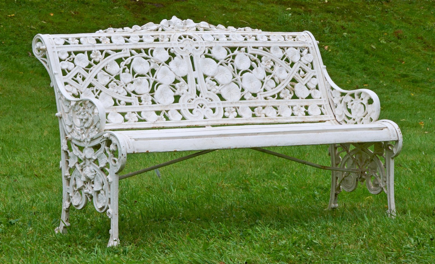 Gusseisen und Holz, weiß lackiert. Durchbrochen gearbeitete Seitenwangen aus üppigen Blattvoluten. Korrespondierende, zurückschwingende Rückenlehnenrahmung aus arabesk angeordneten Seerosenblättern und Maskaronbekrönung. Sitzfläche aus schmalen Stegen. Bez. Coal Brookdake. H. 86 cm. 132 cm x 70 cm. Sitz-H. 45 cm.
