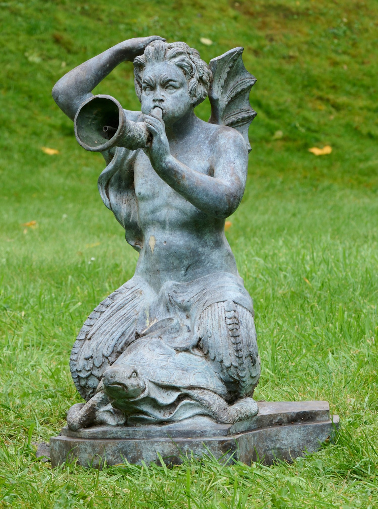 Bronze, grün patiniert. Über schildförmigem Sockel vollplastisch gestalteter, geflügelter Triton mit Fischschwanz, auf einer Meerenschildkröte reitend. In seiner Hand gestrecktes Schneckenhorn als Wasserspeier. H. 67 cm.