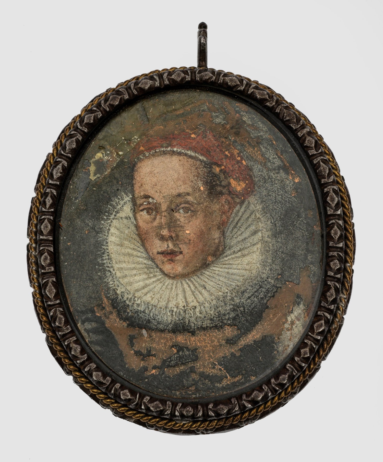 Öl auf Kupferplatte. Ovale Plakette mit Brustbildnis einer Dame mit Halskrause, roter Kopfbedeckung und dunklem Kleid im Halbprofil. Ovaler Rahmen aus Eisen und gedrehtem Messing mit Aufhängeöse. Besch.; 9,5 cm x 7 cm.