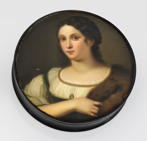 Pappmaché, schwarz lackiert. Rund mit eingezogener Wandung. Auf dem Deckel fein ausgeführtes Brustbildnis einer jungen Dame in weißer Bluse unter grünem Kleid, über der linken Schulter ein Pelzumhang gehängt. Grünbrauner Hintergrund. H. 2,4 cm. D. 10 cm.