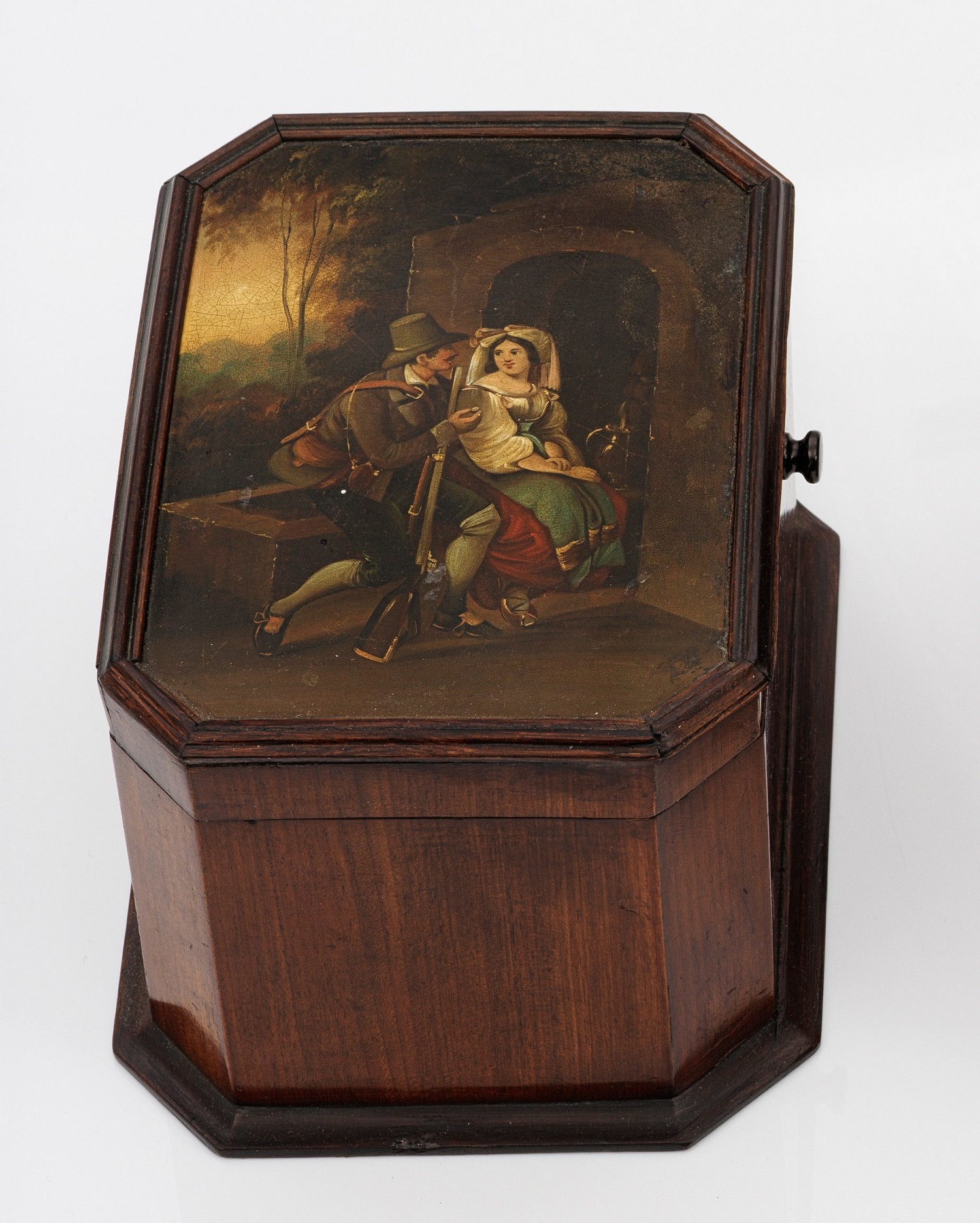 Mahagoni. Rechteckig mit geschrägten Ecken. Auf dem Deckel Darstellung eines an einer Quelle sitzenden Paares in waldiger Landschaft in polychromer Lackmalerei. H. 11 cm. 14,5 cm x 19,5 cm.