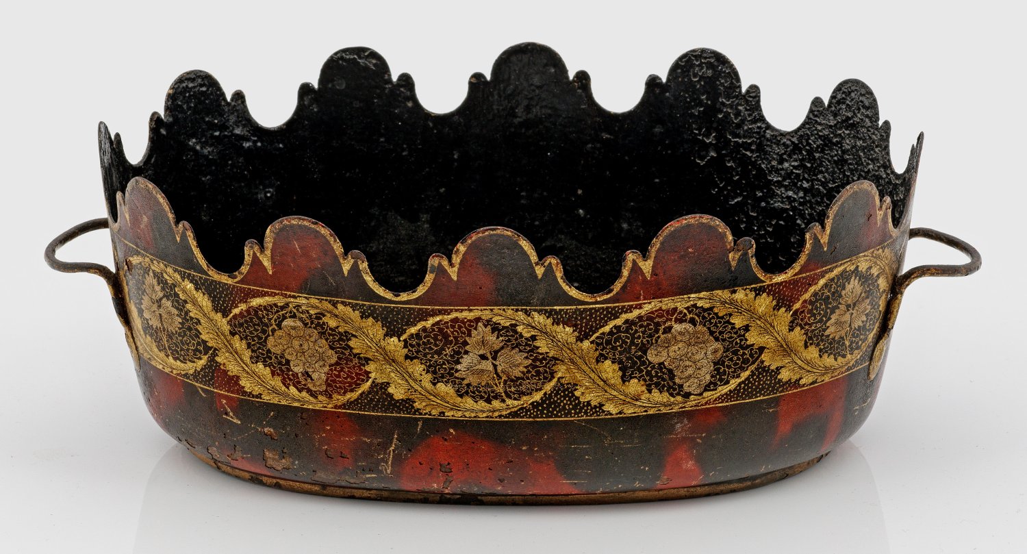 Weißblech, schwarz lackiert. Ovale, tief gemuldete Schale mit passig geschweiftem Rand. Rot und dunkel marmorierte Wandung, umzogen von breitem, goldenem Zierband mit Blattranken, Weinblatt- und Weinrebendekor. Seitlich zwei schmale Henkel. H. 10,7 cm. 31,5 cm x 20,5 cm.