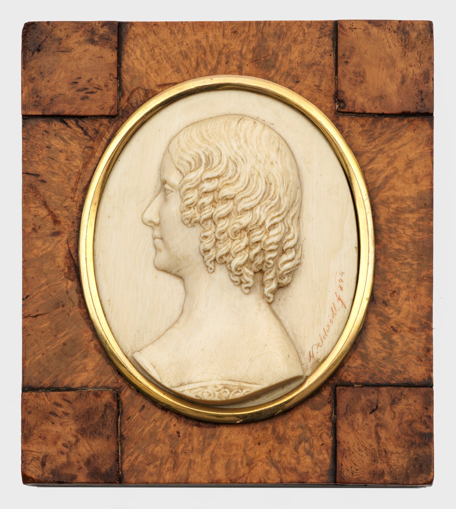 Elfenbein geschnitzt. Sign. u. dat. (1)844. Montiert in Original-Biedermeier-Rahmen. Schrödl erhielt seine erste Ausbildung beim Bildhauer Friedrich Schmidt in Wien, 1833/34 studierte er an der Wiener Akademie Bildhauerei, eine weitere Ausbildung erhielt er vom Kammermedailleur Leopold Heuberger. Als begehrter Elfenbeinschnitzer erhielt Schrödl bald Aufträge der Kaiserfamilie. 1848 begab er sich auf Wanderschaft durch ganz Europa - Dresden, Warschau, Moskau, St. Petersburg, Paris, Frankfurt a. M., Hamburg, Köln, Berlin und London. Zu seinen Auftraggebern zählten hochrangige Persönlichkeiten: die russische Zarenfamilie, Kaiser Napoleon III., der Herzog von Hamilton, die Familie Rothschild. 1881 wurde Schrödl in Wien mit der Großen Goldenen Medaille für Kunst und Wissenschaft ausgezeichnet. Medaillon 9,6 cm x 8 cm, Im Oval; Rahmen 13 cm x 11,5 cm.