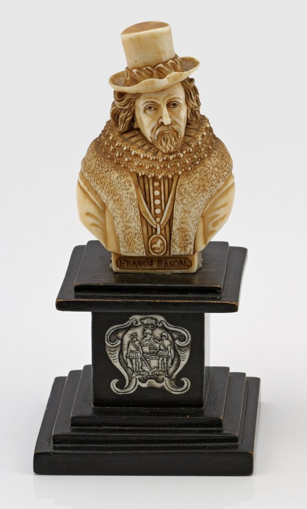 Elfenbein, vollplastisch geschnitzt. Monogr. "GJ" u. betitelt. Montiert auf quadratischem, ebonisiertem Holzsockel. Überaus fein und detailreich ausgeführte, repräsentative Büste des bedeutenden englischen Philosophen, Juristen und Staatsmanns (1561 - 1626). Schauseitig auf dem Sockel eingelegtes Wappen mit Devise. Ges.-H. 15 cm.