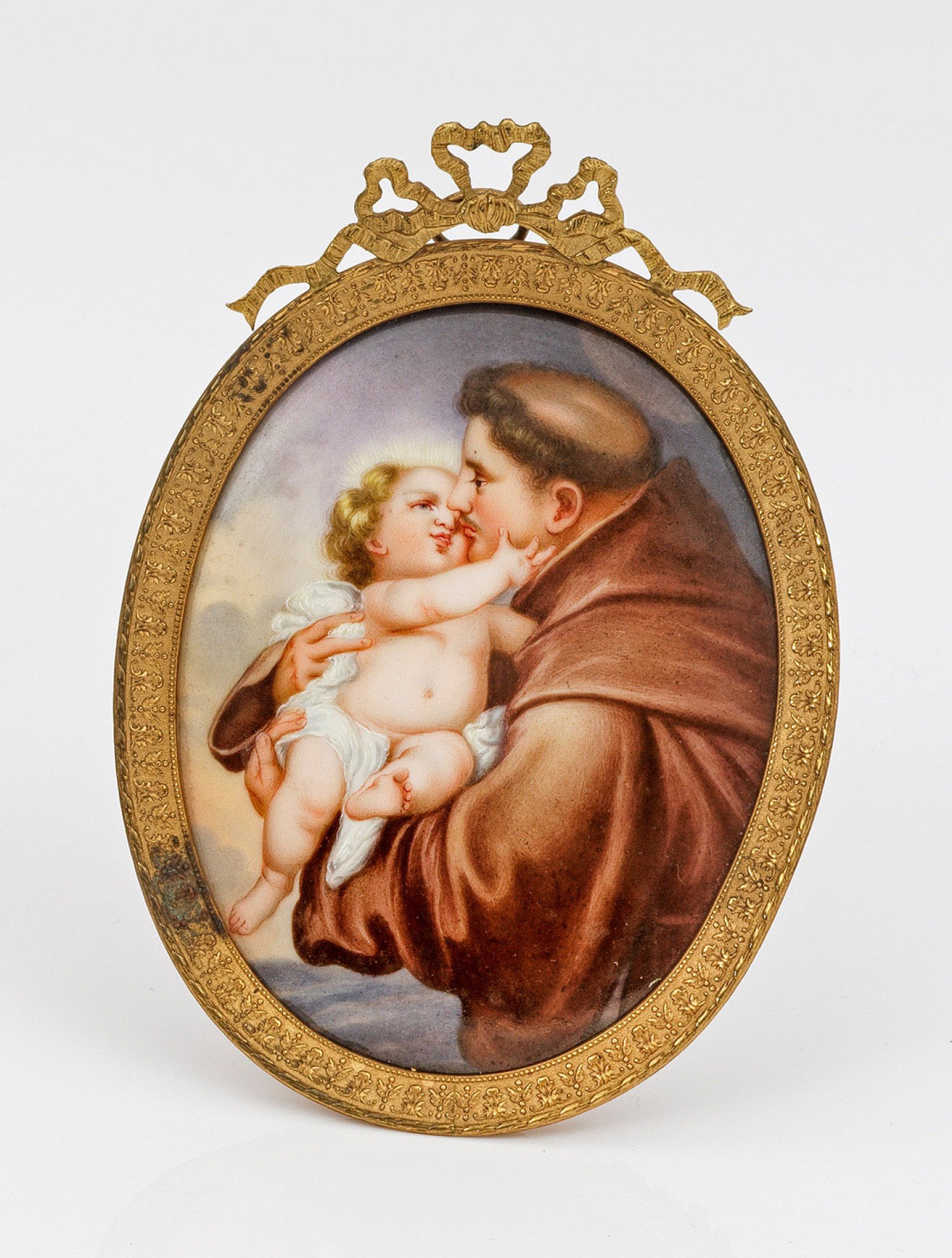 Hochovale Bildplatte aus Porzellan mit der Darstellung des Hl. Antonius von Padua, das Jesuskind tragend. Nach einem Gemälde von Bartolomé Esteban Murillo. Verso gest. "IZ". Feuervergoldeter Bronzerahmen mit Blattrelief, oben abgeschlossen von einer Schleife. Rücks. Aufsteller und Öse zum Aufhängen. Mit Rahmen 16 cm x 11,5 cm.