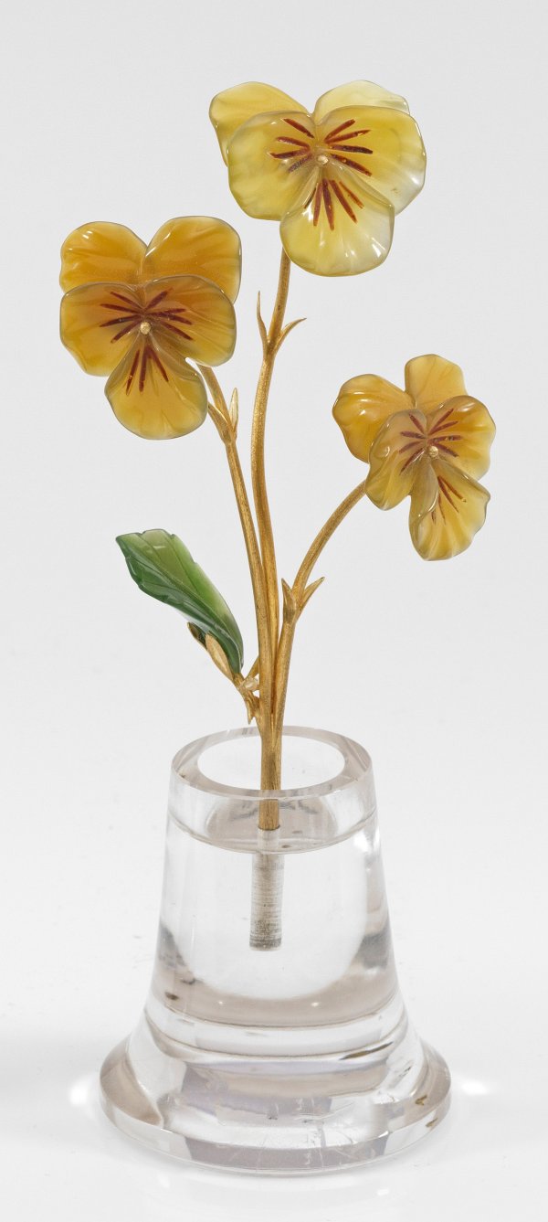 in der Art von Karl Fabergé. Silber, teilw. vergoldet sowie Bergkristall und Nephrit. Stand in Form einer konischen Vase aus Bergkristall. Herausnehmbarer Stiefmütterchen-Zweig aus vergoldetem Silberdraht mit Gelbachat-Blüten sowie Jade-Blättern. Gew. zus. ca. 170 g. H. 15 cm. D. 5 cm