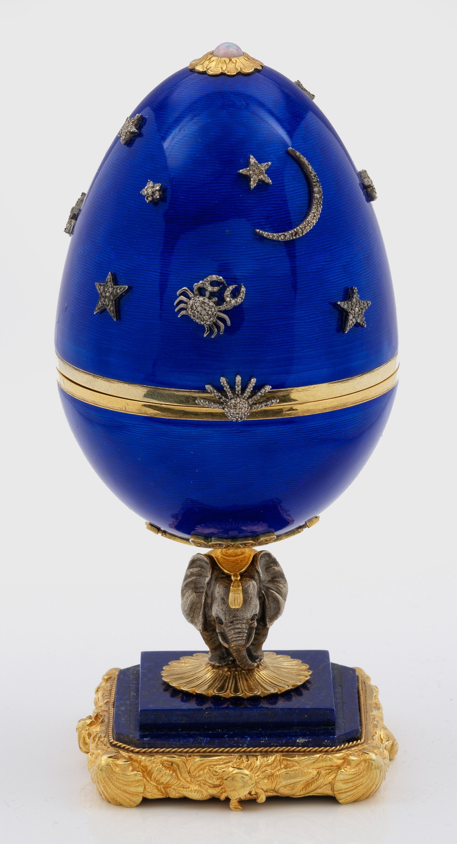 im Stil von Karl Fabergé. Silber, teilw. vergoldet und emailliert. Quadratischer, getreppter Sockel aus Lapislazuli, eingefasst von vergoldetem Relieffries mit Meereslebewesen. Darauf als Schaft, inmitten einer applizierten Blüte, naturalistisch gearbeiteter Elefant mit roten Farbcabochons als Augen. Ovoider, im unteren Drittel scharnierter Korpus in Form eines prunkvoll gestalteten Eies. Flächendeckend royalblau emailliert über wellenförmig guillochiertem Grund. Der Korpus mit üppigen Applikationen in Form von Sternen, einem Krebs und einer Mondsichel, besetzt mit Diamantrosen. Als Deckelknauf ein Opal in einer vergoldeten Blüte. Gest. Kokoschnik 88. Gew. ca. 480 g. H. 15 cm. D. 7 cm.