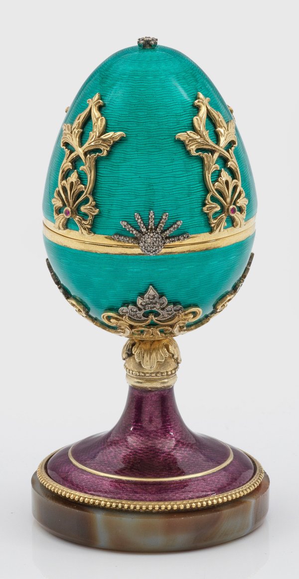 im Stil von Karl Fabergé. Silber, teilw. vergoldet bzw. emailliert. Auf rundem Sockel aus Achat violett emaillierter und guillochierter Fuß mit vergoldeten Profillinien und kurzer Schaft mit reliefiertem Blätterkranz um vergoldeten Nodus. Ovoider, im unteren Drittel scharnierter, seegrün emaillierter und guillochierter Korpus. Reiche, vegetabile und volutierte Applikationen, teilw. vergoldet, teilw. besetzt mit roten Farbsteincabochons und Diamantrosen. Gest.; Gew. ca. 300 g. H. 11,5 cm.