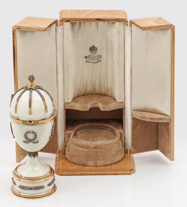 im Stil von Karl Fabergé. 585 Gelbgold, Silber, teilw. vergoldet und emailliert. Über zylindrischem Stand eingezogener Schaft. Darüber ovoider, mittig scharnierter Korpus in Form eines prunkvoll gestalteten Eis. Flächendeckend opalweiß emailliert über wellenförmig und netzartig guillochiertem Grund. Stand und Schaft mit reichen Verzierungen in Form von Perlband und Eierstab, stilisierten Blattkränzen mit Blütenrosetten und Profilringen. Der Korpus mit üppigen Applikationen in Form von Lorbeerkränzen und senkrechten Linien, teilw. besetzt mit Granatcabochons und Diamantrosen. Als Knauf ein Pinienzapfen. In aufgeklapptem Zustand wird das Sankt Petersburger Denkmal Zar Peters des Großen in vergoldeter Miniatur auf silbernem Felsen auf guillochiertem, rot emailliertem Grund sichtbar. Gest. Kokoschnik 88; 56; AH; "Fabergé" (kyrillisch). Mit Holzbox. Gew. ca. 535 g. H. 16,5 cm. D. 5 cm