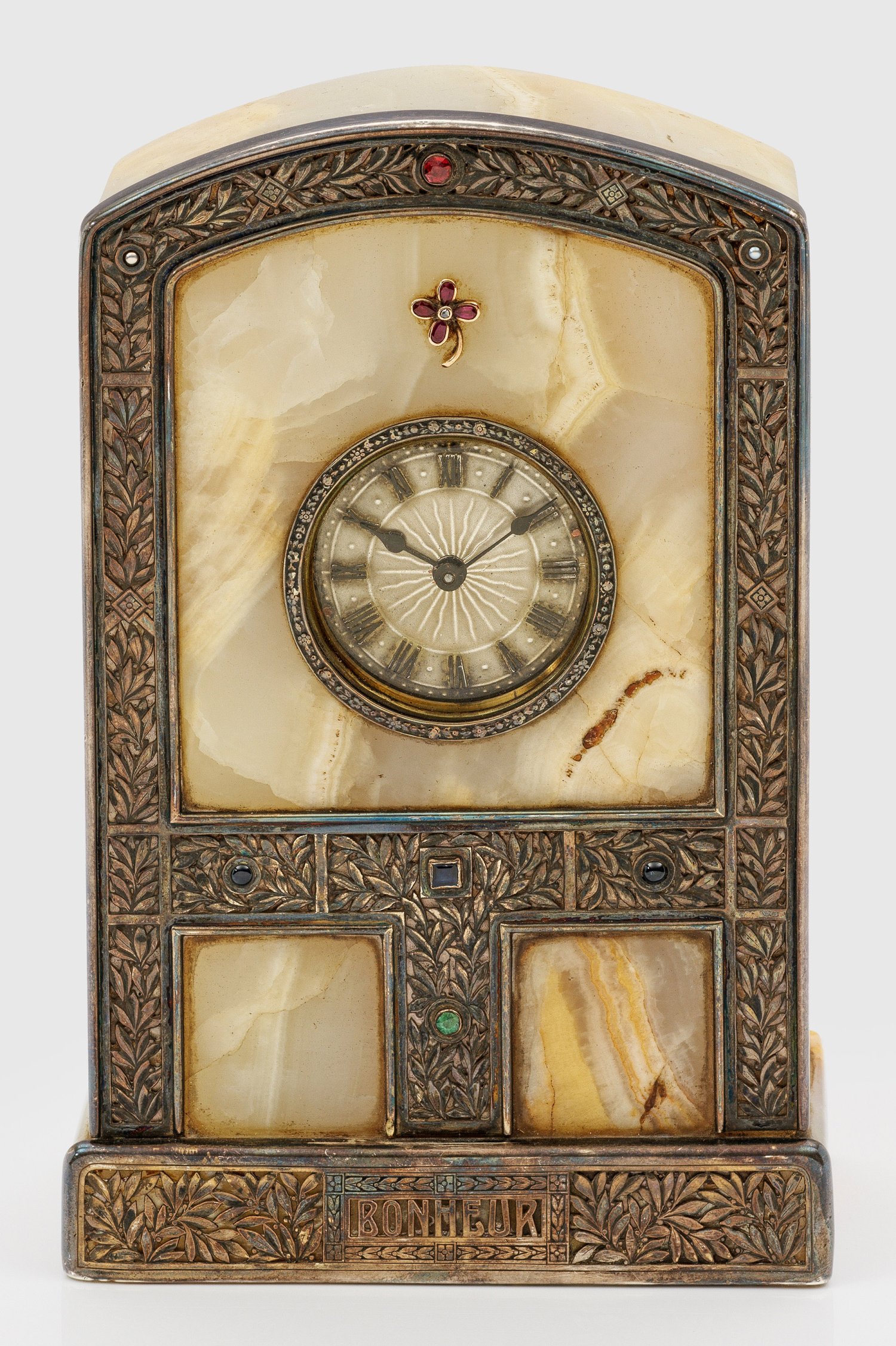 Marmor und Silber. Über flacher Bodenplatte hochrechteckiger Marmor-Korpus mit gewölbtem oberen Abschluss. Rundes Uhrengehäuse. Schauseitige Silbermontierung verziert mit Blätterranken. Besetzt mit kleinen Saphiren, Rubinen und einem Smaragd. Auf dem Sockel von Blätterfries gerahmter Schriftzug "Bonheur". Silberfarbenes, verglastes Zifferblatt mit schwarzen, römischen Zahlen, bekrönt von kleiner applizierter Blüte. Blende mit Blütenranken. Werk mit Schlüsselaufzug. Gest., Beschaumarke, Meister Karl Knillinger (tätig um 1900). H. 17,5 cm.