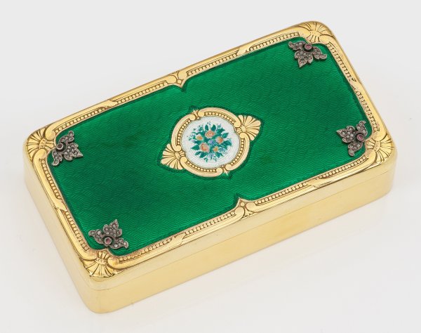 im Stil von Karl Fabergé. Silber, teilw. vergoldet und teilw. emailliert. Rechteckiger Korpus mit gerundeten Ecken und Kanten. Scharnierter Deckel dunkelgrün emailliert und wellenförmig guillochiert. Der Rand mit ziselierten Palmetten und Perlfries verziert. In den Ecken applizierte und stilisierte Blütenkelche ausgefasst mit Diamantrosen und roten Farbcabochons. Zentral appliziertes, rundes Medaillon mit polychrom emailliertem Blumengebinde, gerahmt von Perlfries und Palmetten. Mit Holzbox. Gest. 88. Gew. ca. 335 g. H. 3,5 cm. 12,5 cm x 6,5 cm.