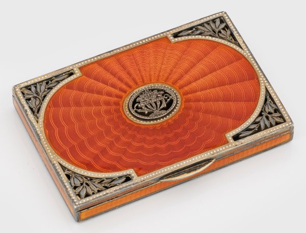 Silber, vergoldet und emailliert. Rechteckiger Korpus. Flächen rot emailliert und wellenförmig guillochiert, Kanten und Ränder sowie Deckelscharnier vergoldet. Deckel mit zentral durchbrochen gearbeiteter, ovalen Kartusche mit Henkelschale und durchbrochen gearbeiteten Randsegmenten mit Blattornamenten. Gest. Beschauzeichen, unidentifiziertes Meisterzeichen "R S". Gew. ca. 160 g. H. 1,2 cm. 6 cm x 9 cm.
