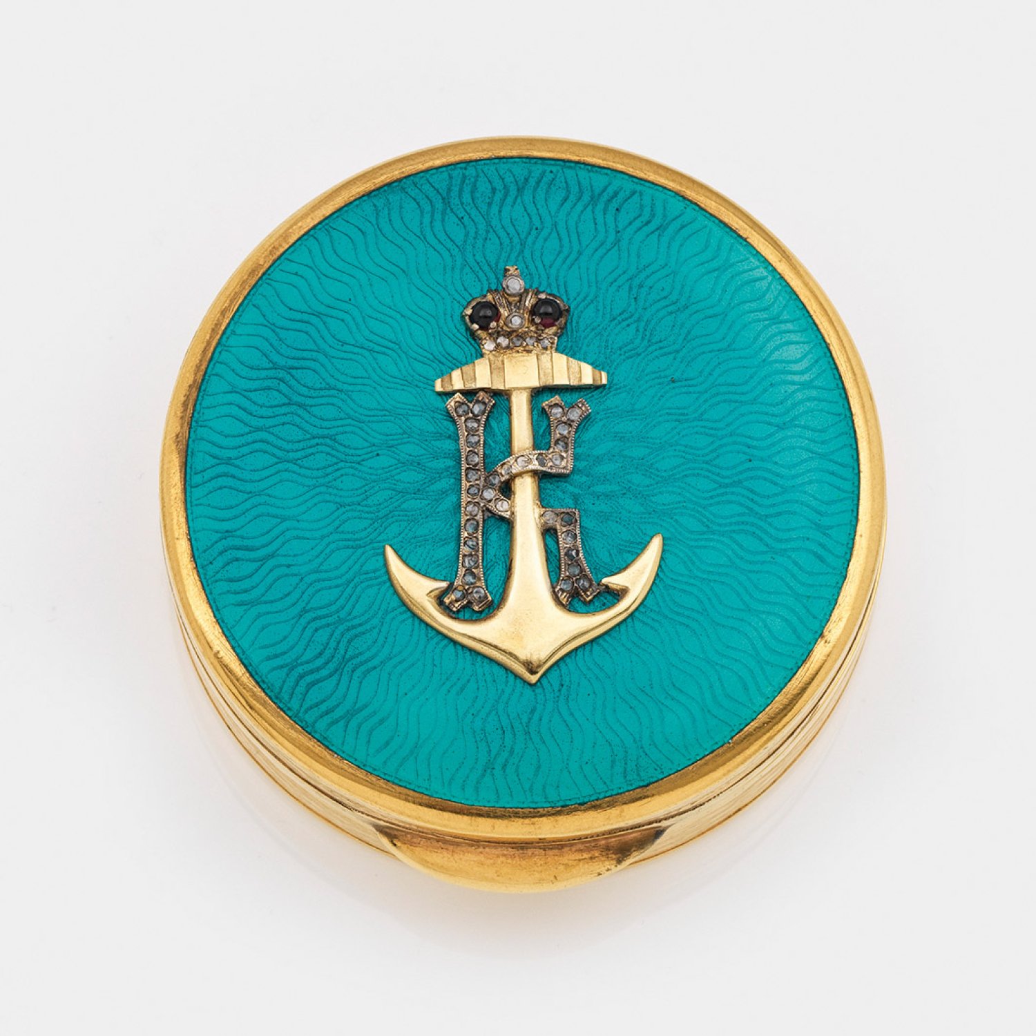 im Stil von Karl Fabergé. Silber, vergoldet, teilw. emailliert. Runde Form. Auf gering gewölbtem, scharniertem Deckel über türkis emailliertem und strahlenförmig guillochiertem Grund ein appliziertes Monogramm "K" mit bekröntem Anker und Diamantrosen besetzt. Die Wandung von wellenförmigem Guillochedekor umzogen. Gest. 88. Gew. ca. 155 g. H. 2,5 cm. D. 7 cm.