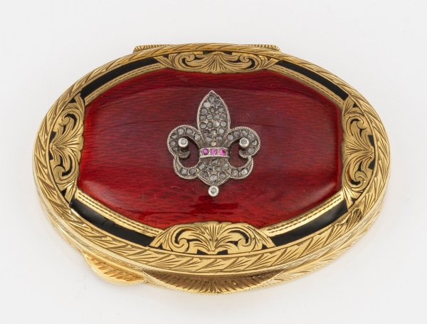 im Stil von Karl Fabergé. Silber, vergoldet und teilw. emailliert. Ovaler Korpus mit aufgewölbtem, wellenförmig guillochiertem und taubenblutrot emailliertem Scharnierdeckel. Zentral besetzt mit stilisierter Lilie, ausgefasst mit kleinen Diamantrosen und Farbsteincabochons. Schwarz emaillierter, schmaler Rahmen, gegliedert von vier ziselierten Blattornamenten. Wandung und Bodenunterseite fein und üppig graviert mit Blattbordüren. Gest. 88. Gew. ca. 80 g. H. 1,8 cm. 6,5 cm x 4,5 cm.