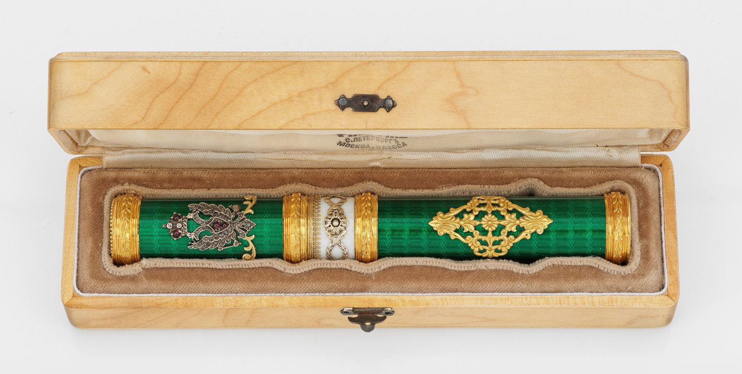im Stil von Karl Fabergé. Silber, teilw. vergoldet. Zylindrische Form mit Stulpdeckel. Umlaufend dunkelgrün emailliert über feinem, wellenförmig guillochiertem Grund. Reliefierte Ränder aus stilisiertem Lorbeerkranzdekor und Perlrand. Mittig, unterhalb des Deckelansatzes, abgesetztes, perlmutterfarbenes, emailliertes Band über guillochiertem Grund. Darauf appliziert zwei eingedrehte Lorbeergirlanden und Blüte. Schauseitig auf dem Deckel großer, reliefplastischer Doppeladler, besetzt mit roten Farbcabochons und Diamantrosen. Deckeloberseite mit Blütenapplikation und Farbcabochon. Korpus schauseitig mit appliziertem Blüten- und Volutenornament. Mit Holzbox. Gest. 88. Gew. ca. 255 g. L. 19,5 cm. D. 3 cm.