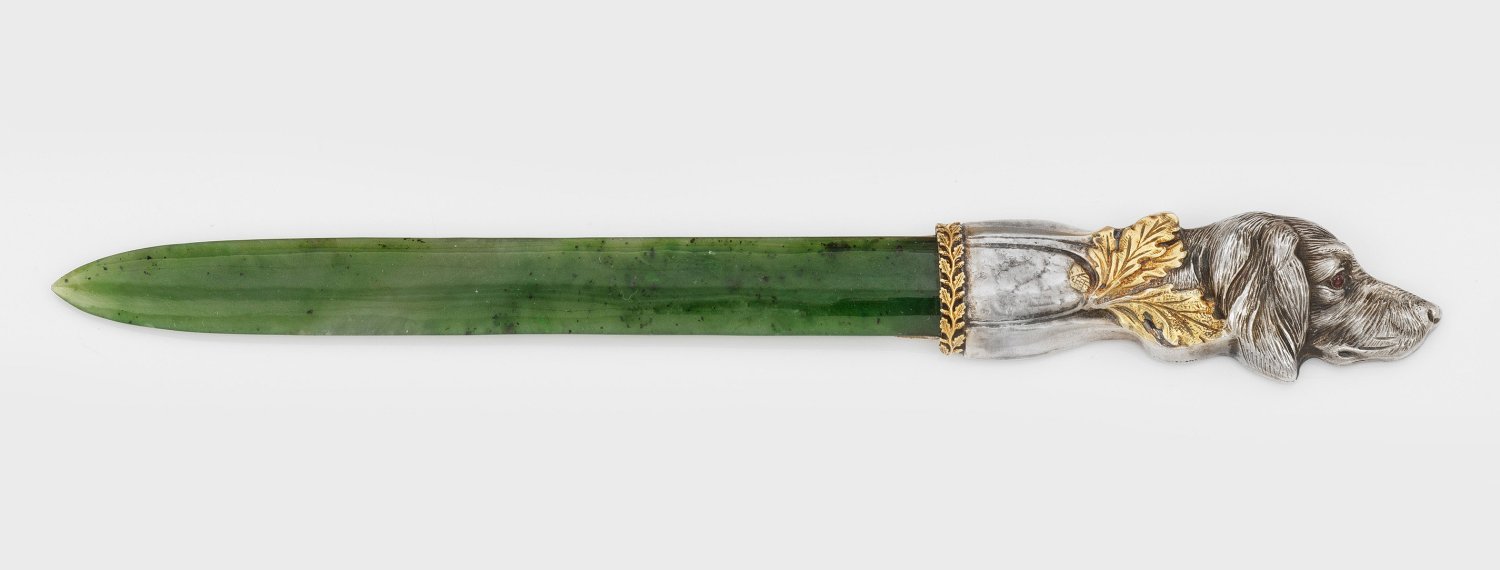 im Stil von Karl Fabergé. Silber, teilw. vergoldet. Konische Klinge aus moosgrünem Nephrit, übergehend in reliefplastisch gestalteten Griff in Form eines Hundekopfes, mit Eichenlaub verziert und mit Granatcabochon als Auge. Gest. 88. L. 24 cm.