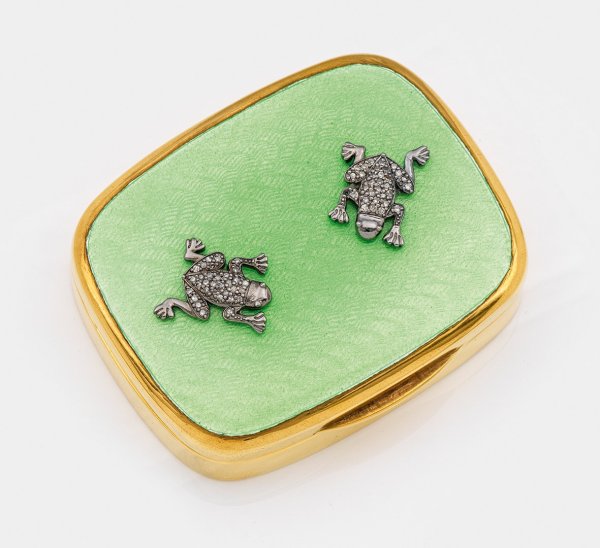 im Stil von Karl Fabergé. Silber, vergoldet, teilw. emailliert. Rechteckige Form mit gerundeten Ecken. Auf gering gewölbtem, scharniertem Deckel über lindgrün emailliertem und wellenförmig guillochiertem Grund zwei applizierte, reliefplastische Frösche mit Diamantrosen besetzt. Gest. 88. Gew. ca. 150 g. H. 2 cm. 7 cm x 5,5 cm.