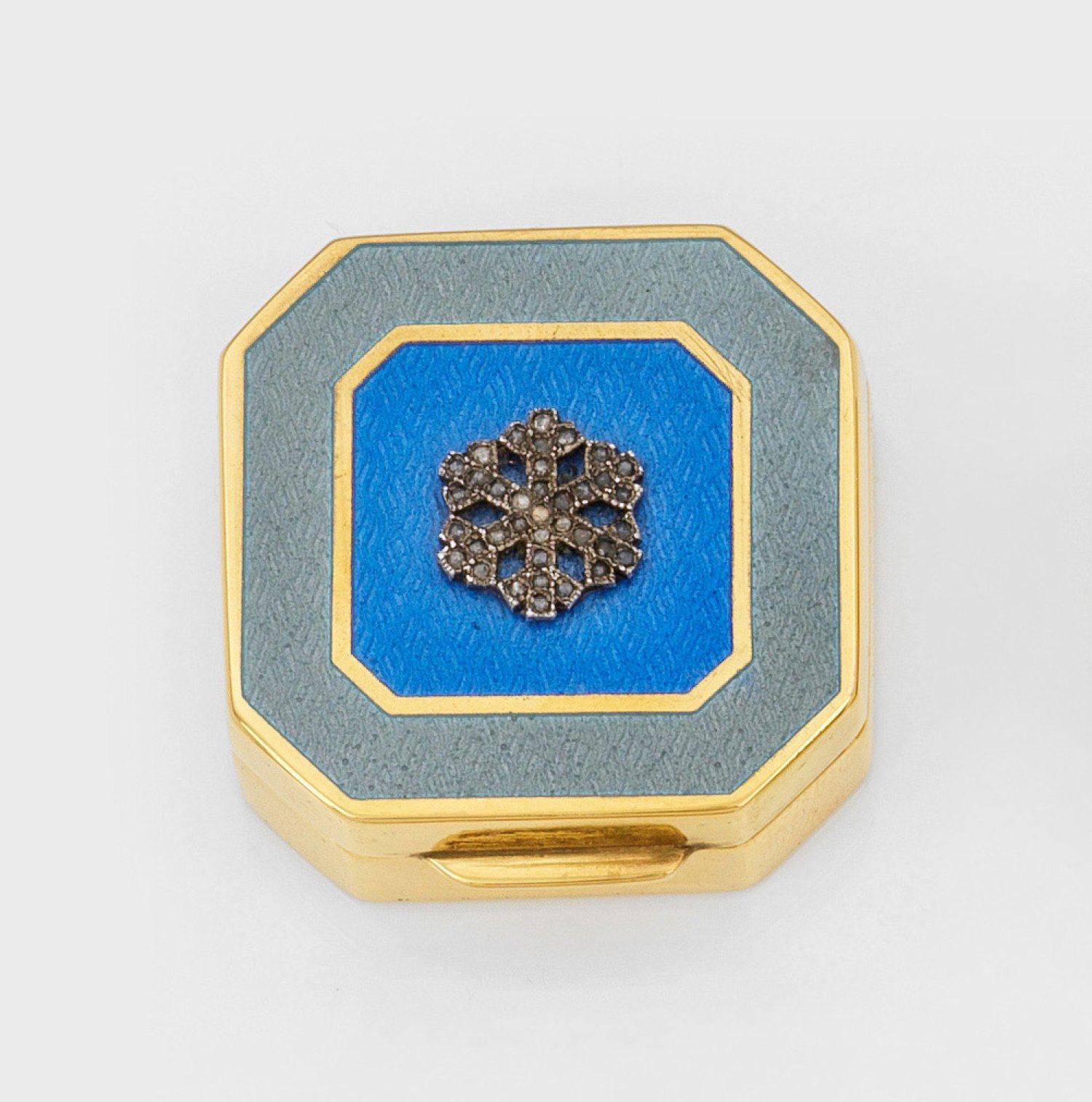 im Stil von Karl Fabergé. Silber, vergoldet und teilw. emailliert. Quadratischer Korpus mit gekanteten Ecken. Auf flachem Deckel applizierte Schneeflocke, ausgefasst mit kleinen Diamantrosen über guillochiertem, blau emailliertem Grund. Umlaufend grau emaillierter Rahmen mit goldener Profillinie. Gest. 88. Gew. ca. 34 g. H. 1,1 cm. D. 3,3 cm.