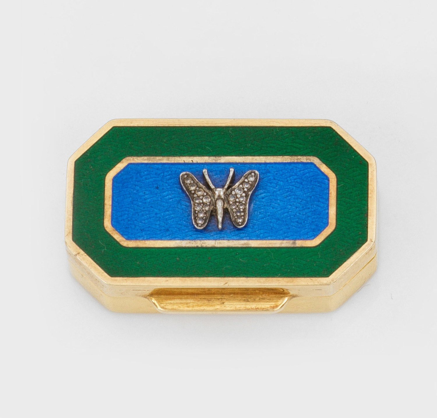 im Stil von Karl Fabergé. Silber, vergoldet und emailliert. Rechteckiger Korpus mit gekanteten Ecken. Scharnierter Deckel, zentral besetzt mit kleinem, appliziertem Schmetterling, ausgefasst mit Diamantrosen über royalblau emailliertem und guillochiertem Grund. Umlaufend dunkelgrün emaillierter Rahmen mit goldener Profillinie. Gest. 88. Gew. ca. 36 g. H. 1,2 cm. 3,8 cm x 2,2 cm.