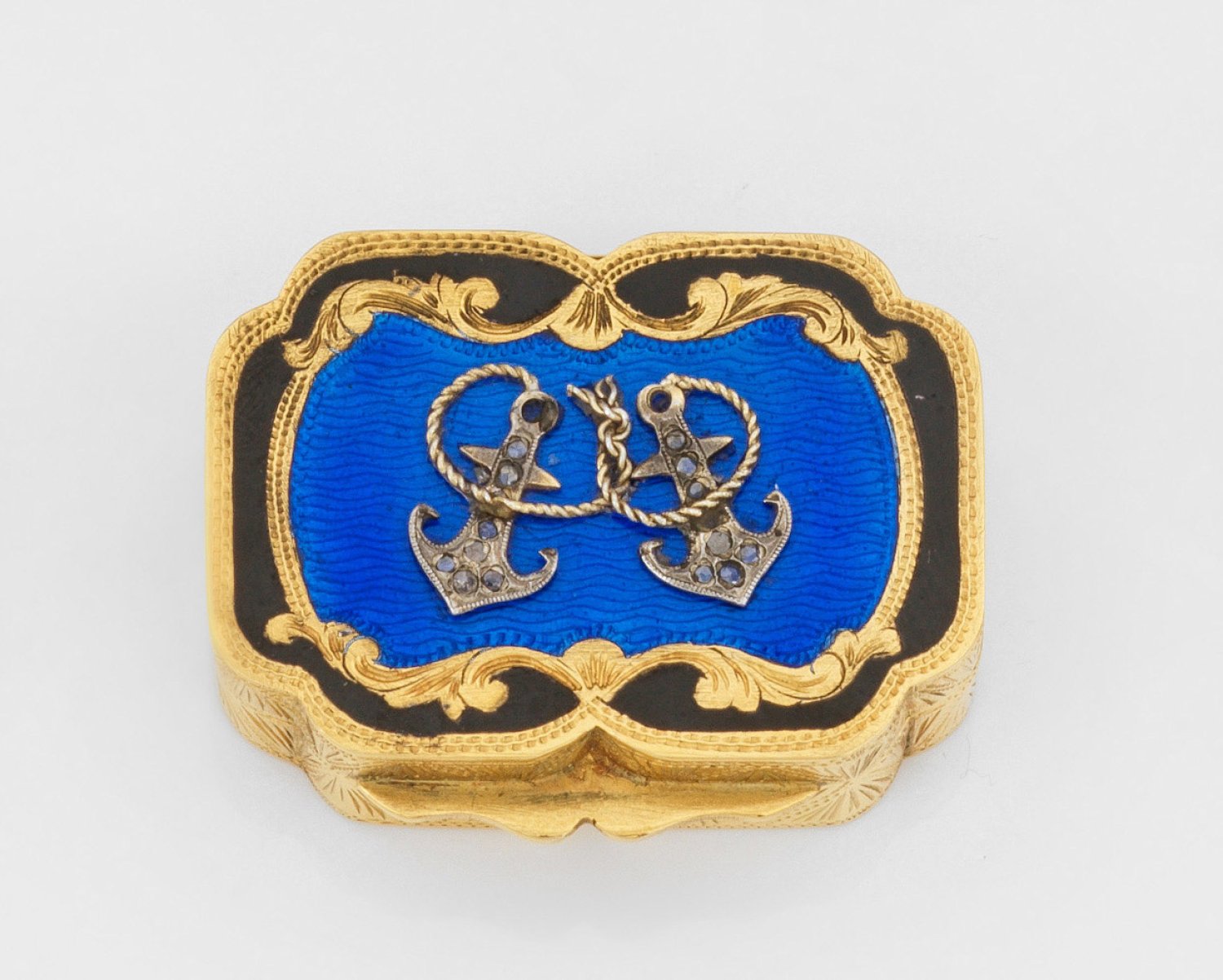 im Stil von Karl Fabergé. Silber, vergoldet und teilw. emailliert. Rechteckiger Korpus mit passig geschweifter Wandung und eingezogenen Ecken. Scharnierter Deckel, zentral besetzt mit zwei kleinen, applizierten Ankern mit verschlungenen Tauen, ausgefasst mit Diamantrosen über royalblau emailliertem und guillochiertem Grund. Umlaufend schwarz emaillierter Rahmen mit goldener, rocaillierter Profillinie. Gest. 88. Gew. ca. 44 g. H. 1,3 cm. 4,1 cm x 3,8 cm.