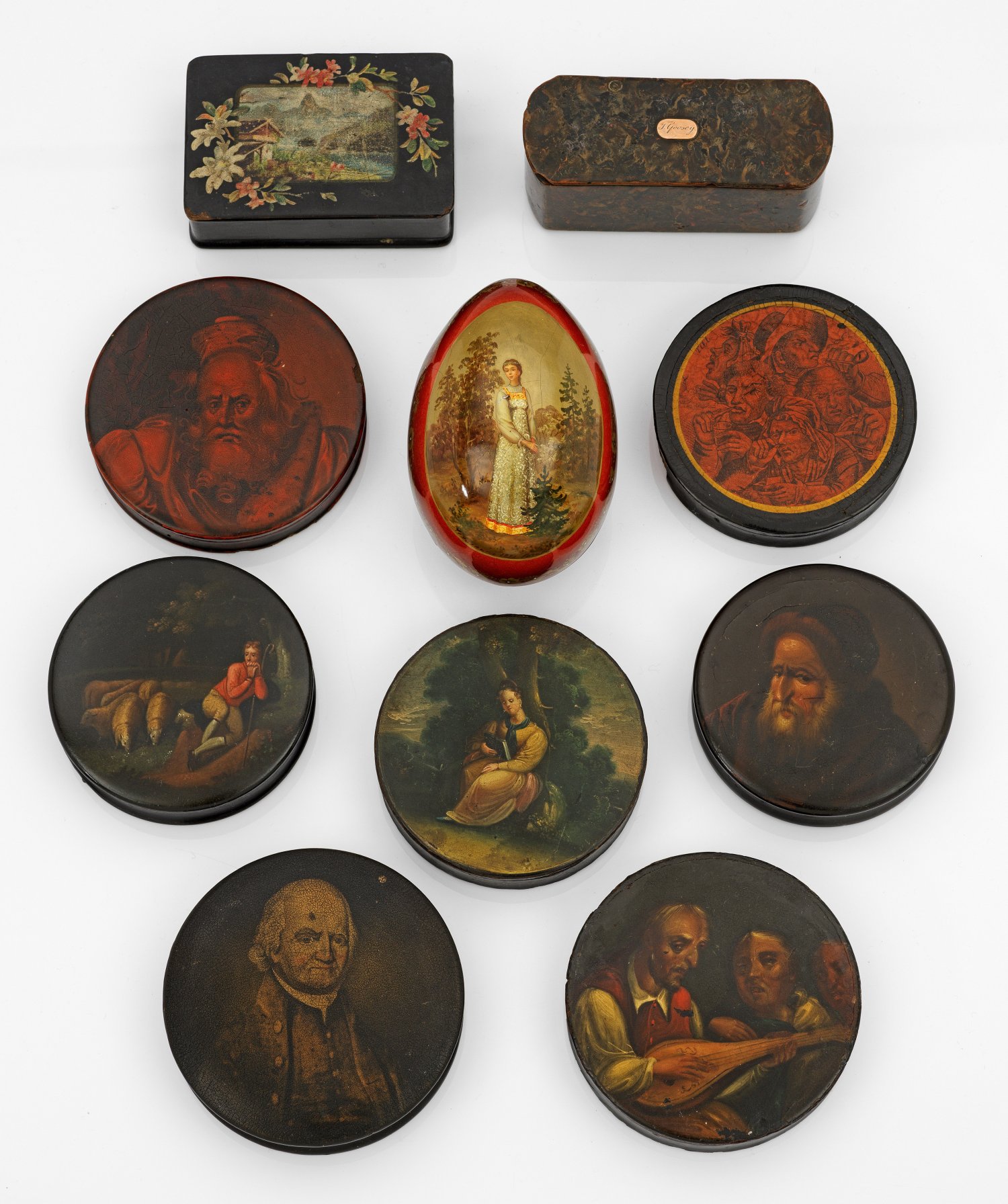 Pappmaché, schwarz bzw. rot lackiert. Runde, ovoide sowie rechteckige Form mit gerundeten Ecken. Die Deckel mit unterschiedlichen Darstellungen, wie Herrenporträts, Landschaften oder eine Dame vor bewaldeter Landschaft sitzend. Teilw. besch.; H. 2 cm - 4,3 cm.