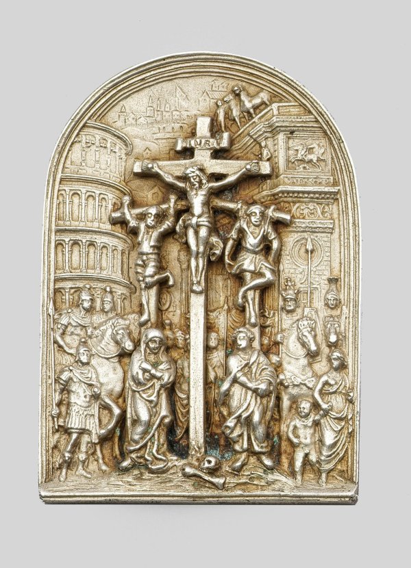A small German silver relief plaque depicting the Crucifixion of Christ in Rome.