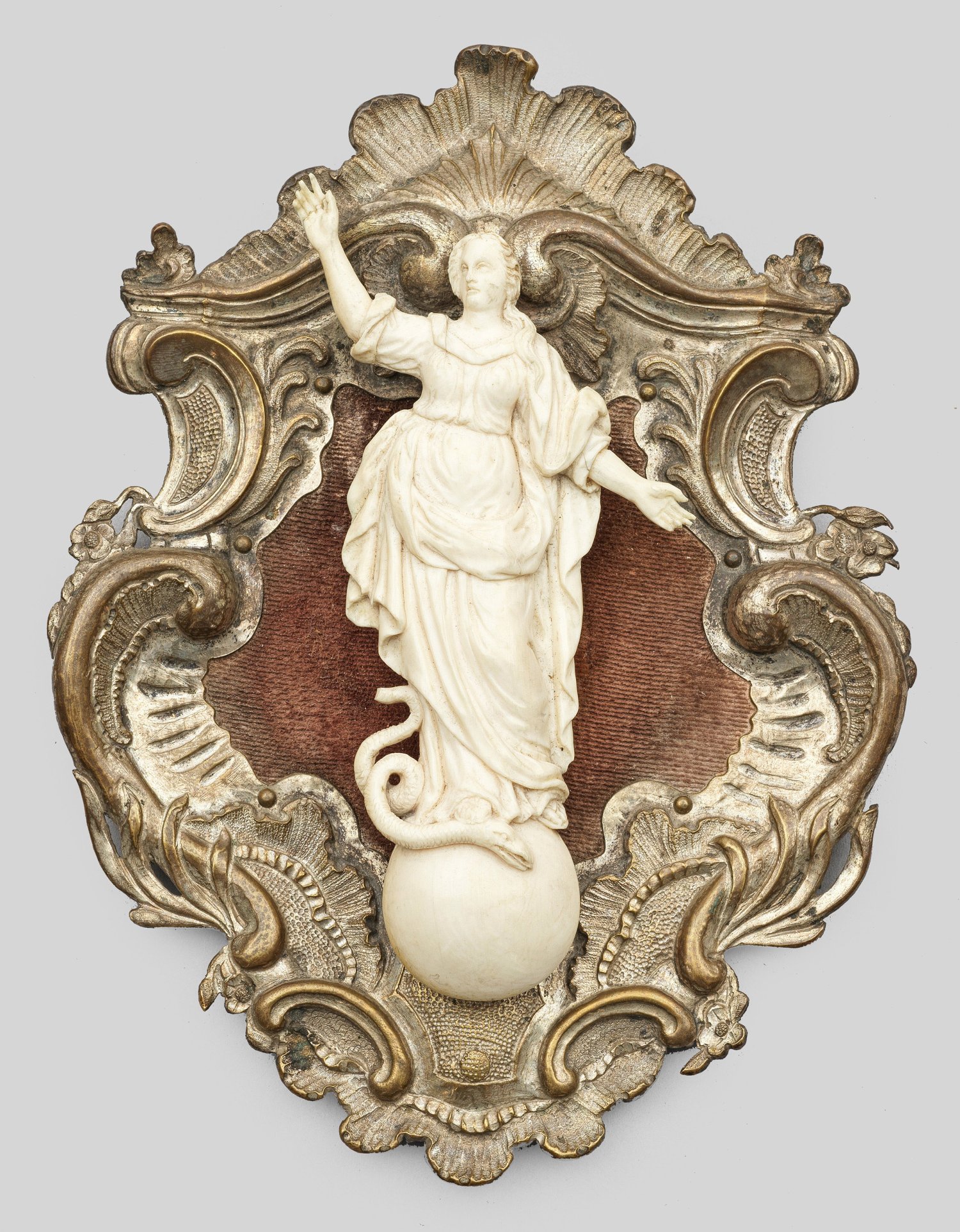 Elfenbein, reliefplastisch geschnitzt. Montiert auf eine mit Samt bezogene Holzplatte, der Rocaillenrahmen aus versilbertem Messing. Fein und detailreiche Darstellung der gestenreich agierenden Maria, auf der Weltkugel und der Schlange stehend. Maria ca. 11,5 cm x 5,6 cm; Ges.-Maße 16,5 cm x 12,5 cm.