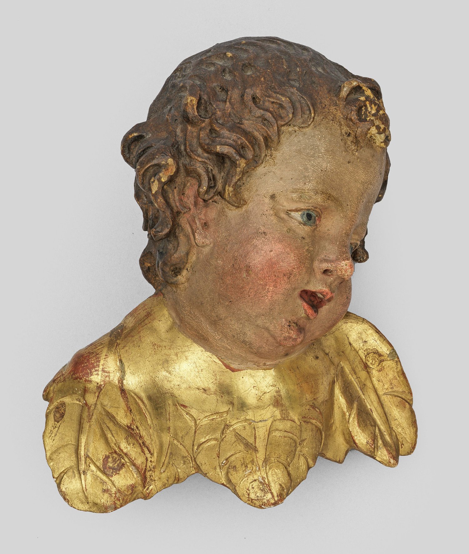Lindenholz, geschnitzt, gefasst und vergoldet. Annähernd vollplastische Darstellung eines zu seiner linken Seite blickenden Engels mit kurzem, gelocktem Haar. Ger. rest.; H. 18,5 cm; B. 13,5 cm.