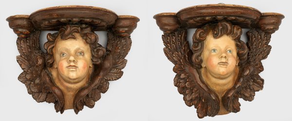 Gegenstücke. Lindenholz, geschnitzt, rücks. abgeflacht, polychrome originale Fassung; die Konsolaufsätze später hinzugefügt. Laut Schwanthaler-Experte Peter Kössl waren die um 1680 entstandenen Engelsköpfe sicherlich einst im oberen Bereich eines Altars angebracht. Es sind "eigenhändige meisterliche Arbeiten des Hauptmeisters der berühmten Rieder Bildhauerfamilie Schwanthaler"; die Zuschreibung an Thomas Schwanthaler basiert auf den "die typischen stark durchstrukturierten Haare, der hohen Stirn, der Stellung der Augen und dem leicht geöffneten Mund. Auch die Verarbeitung der Flügel ist typisch für die Werke des Künstlers", dem bedeutendsten Bildschnitzer in der zweiten Hälfte des 17. Jh. im Raum des heutigen Oberösterreichs. H. ca. 45 cm, B. 61 cm, T. 33 cm.