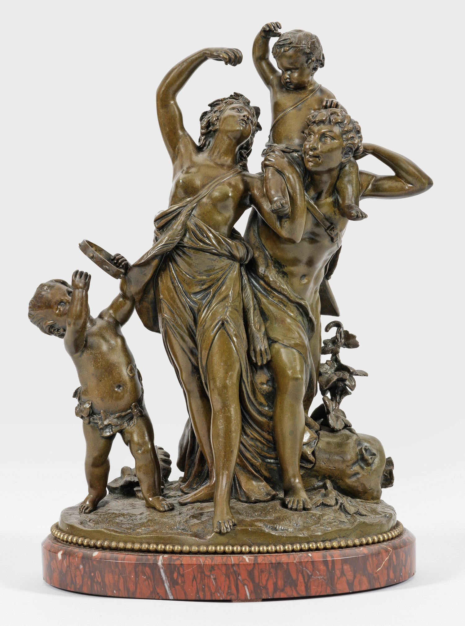 Bronze, braun patiniert. Künstler-Bez.; Dunkelroter Marmorsockel. Guss 19. Jh.; Vollplastische Darstellung. Auf einer ovalen Plinthe schreitendes Bacchantenpaar mit zwei Bacchusknaben. Ges.-H. 42 cm.