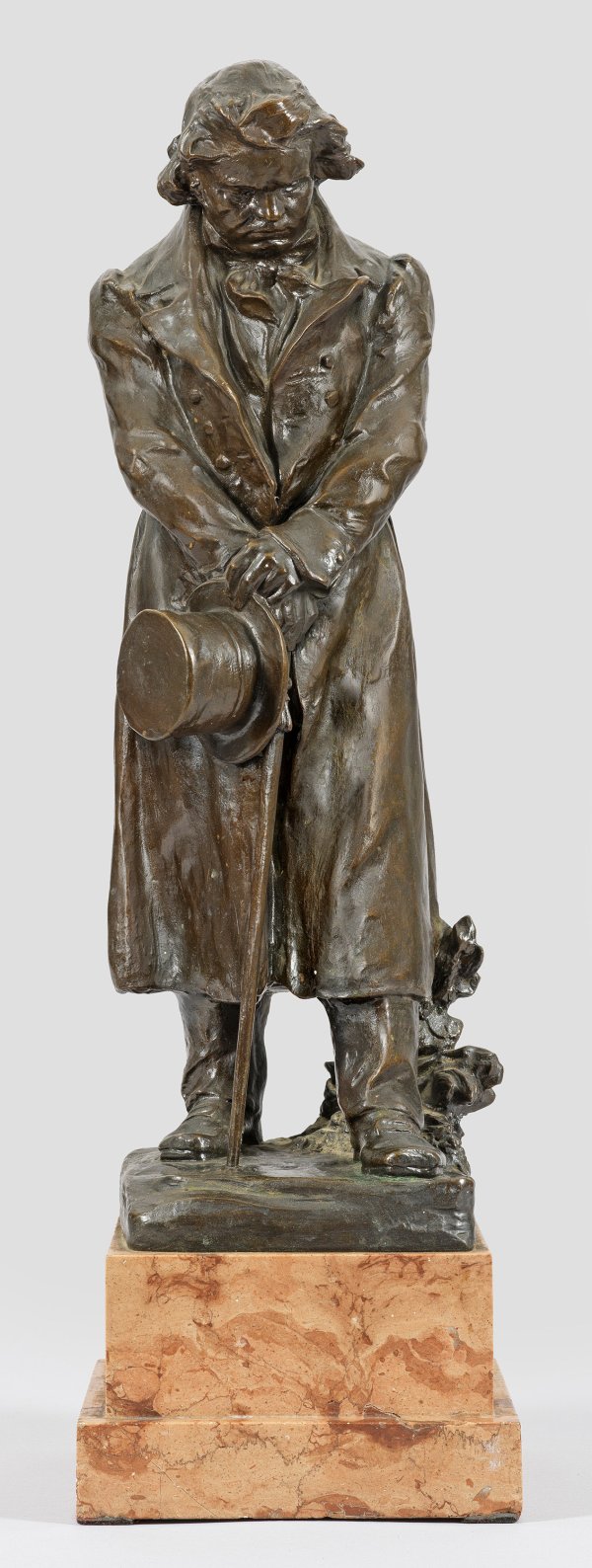 Bronze, dunkelbraun patiniert. Apricotfarbener Mamorsockel, ger. best.; Um 1900-1910 entstandene Darstellung des sinnierenden Beethoven in langem Mantel mit abgesetztem Zylinder, sich auf einen Spazierstock stützend. Müller erhielt seine Ausbildung an der Wiener Kunstgewerbeschule und an der Akademie, seit 1909 war er Mitglied der Wiener Künstlergenossenschaft. Er schuf u. a. Bildnisse und Statuetten von Beethoven, Mozart und Kaiser Franz Josef I.; Bronze-H. 54 cm; Ges.-H. 65,5 cm.