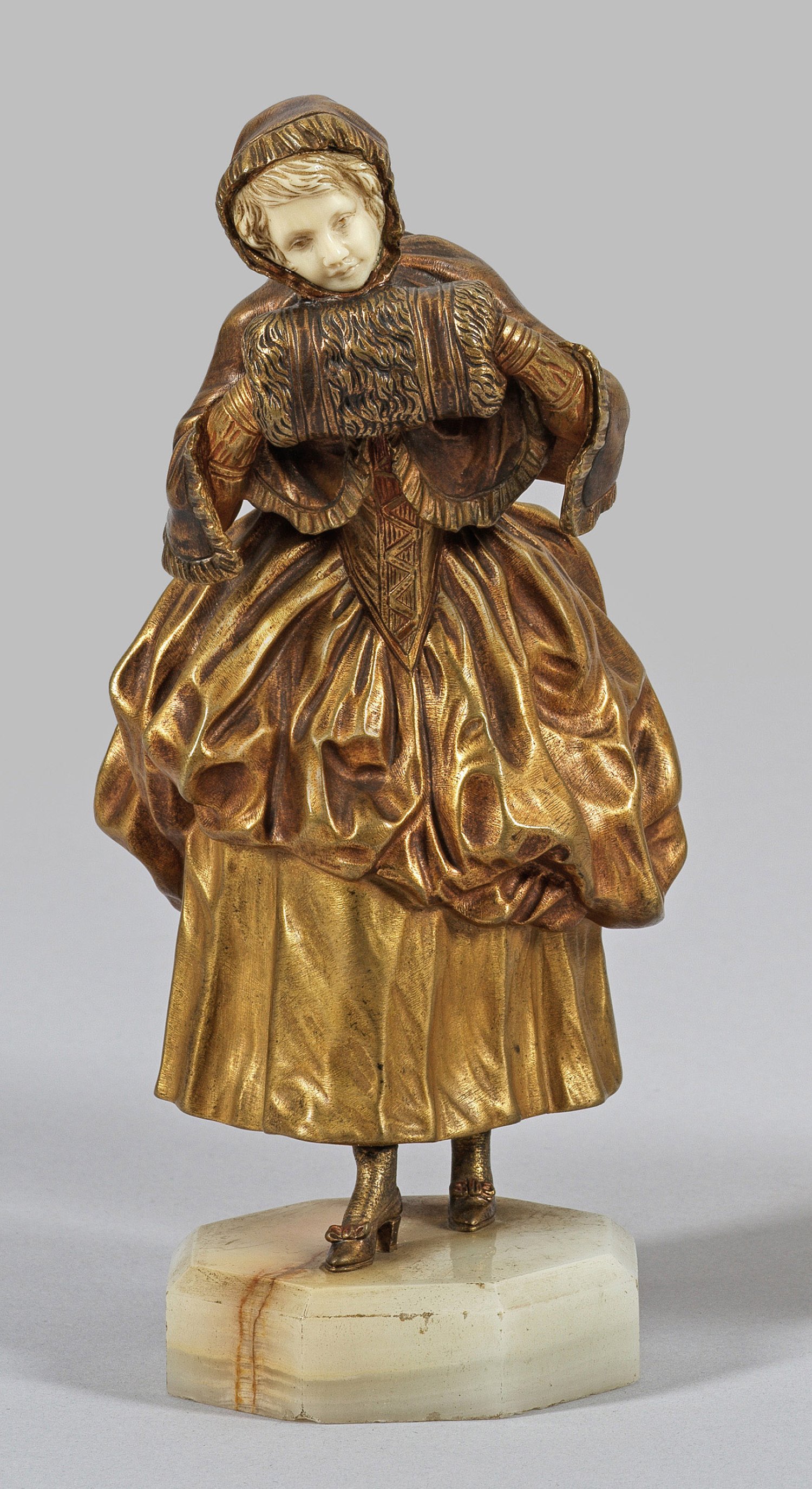 Bronze, goldbraun patiniert bzw. vergoldet; Elfenbein, geschnitzt; achteckige Onyxplinthe. Sign.; Vollplastische, fein ausgeführte Chryselephantin-Statuette der Belle Epoque mit der Darstellung einer jungen, sich einmummelnden Dame in vorgeneigter Pose. Monginots beschickte 1892-1948 regelmäßig den Salon in Paris, 1895 und 1910 wurde sie mit Medaillen ausgezeichnet. Ges.-H. 21 cm.